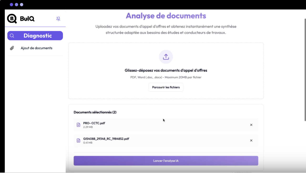 Automatisez la lecture des DCE : l'IA extrait et vous présente les informations essentielles, vous vous concentrez sur l’analyse et le chiffrage.